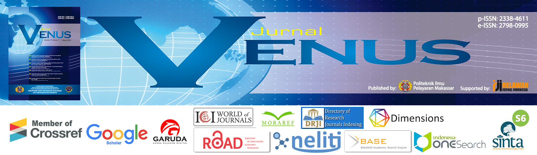 Jurnal Venus is an open-access, peer-reviewed international journal published twice a year (March and September) by the Politeknik Ilmu Pelayaran Makassar, Indonesia. This journal contains research results, ideas from lecturers, instructors, cadets, researchers, and academics in the field of the sea transportation.